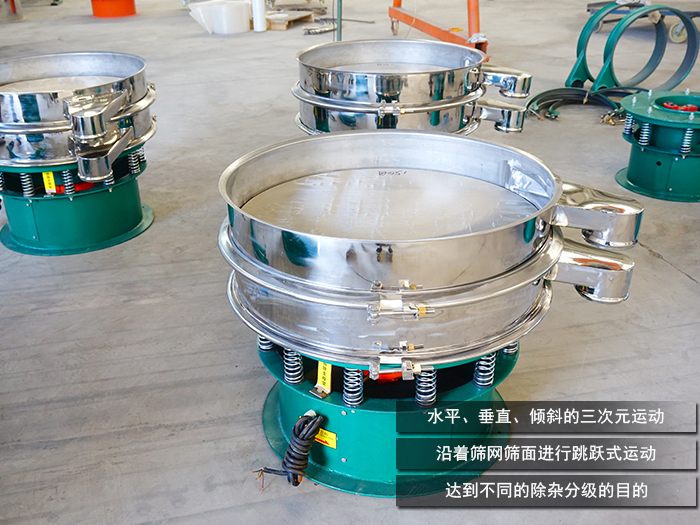 橡膠粉一般分為粗膠粉0.425mm(40目)以上、細膠粉0.425mm—0.180(40—80目)、微細膠粉0.180—0.075mm(80—200目)。DH系列旋振篩通過立式振動電機作為振動源,在篩分過程中將電機的旋轉運動轉變為水平、垂直、傾斜的三次元運動,再把這個運動傳遞給上端的篩面進行橡膠粉篩分。將篩分的橡膠粉沿著篩網篩面進行跳躍式運動,再通過篩面上不同尺寸大小的網孔分級過網,以達到不同的除雜分級的目的。篩網層數高可達到5層,可滿足不同規格的分級除雜。